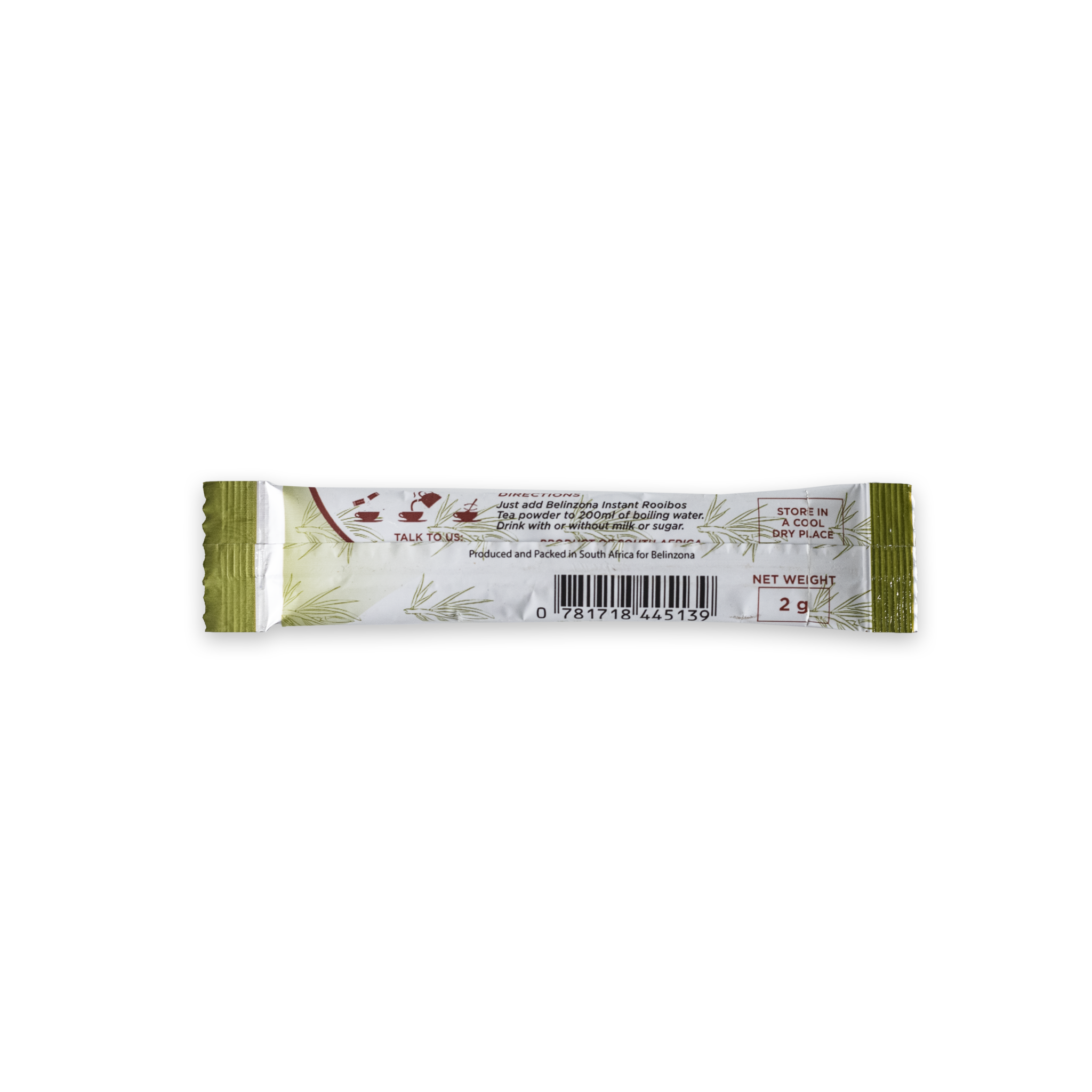 It is of vital importance that the flavour of Belinzona premium instant Rooibos tea is protected.  Our product is therefore specially packed within a barrier laminated film sachet to maintain product freshness while the metallic foil protects tea from oxidation.